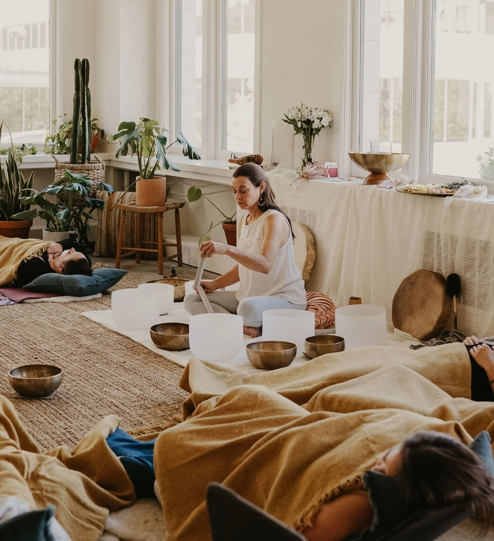 During a sound bath you will lie on the floor of the studio where you will be surrounded by song and sound.